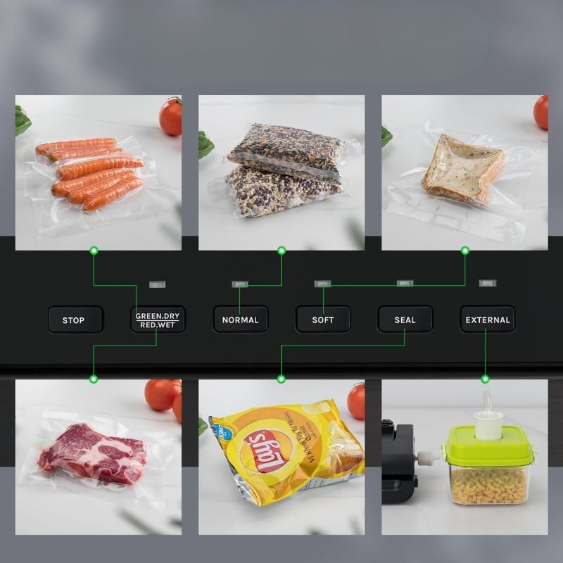 Offre una tripla impostazione di tenuta tra cui standard, media e forte, adattandosi a tutte le vostre esigenze di tenuta. Inoltre consente consente di conservare alimenti cotti, crudi, solidi e liquidi per settimane senza comprometterne la freschezza e la qualità.
